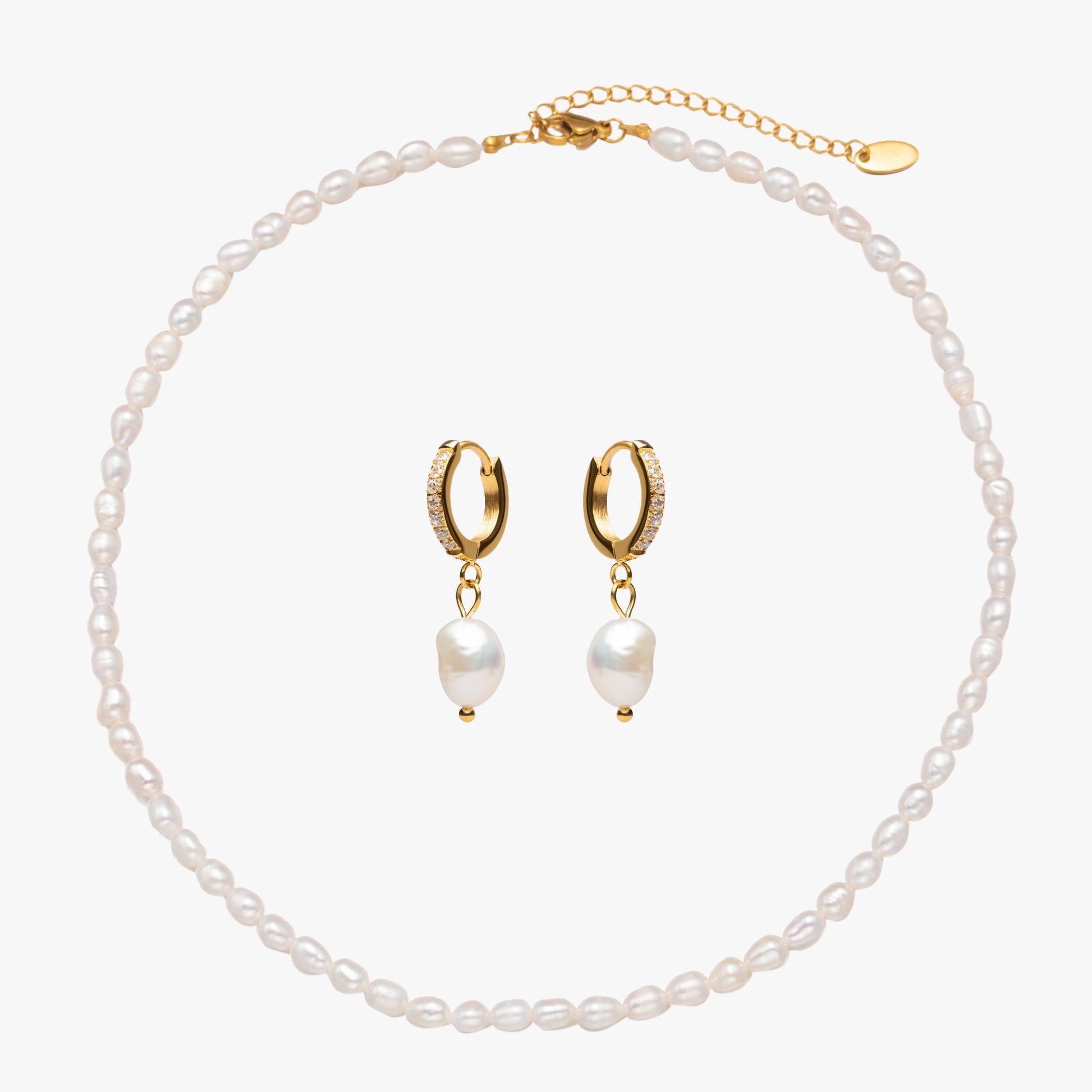 Featuring our elegant freshwater pearl choker, draped delicately around your neck like shimmering droplets from the ocean, paired perfectly with our freshwater pearl hoop earrings.