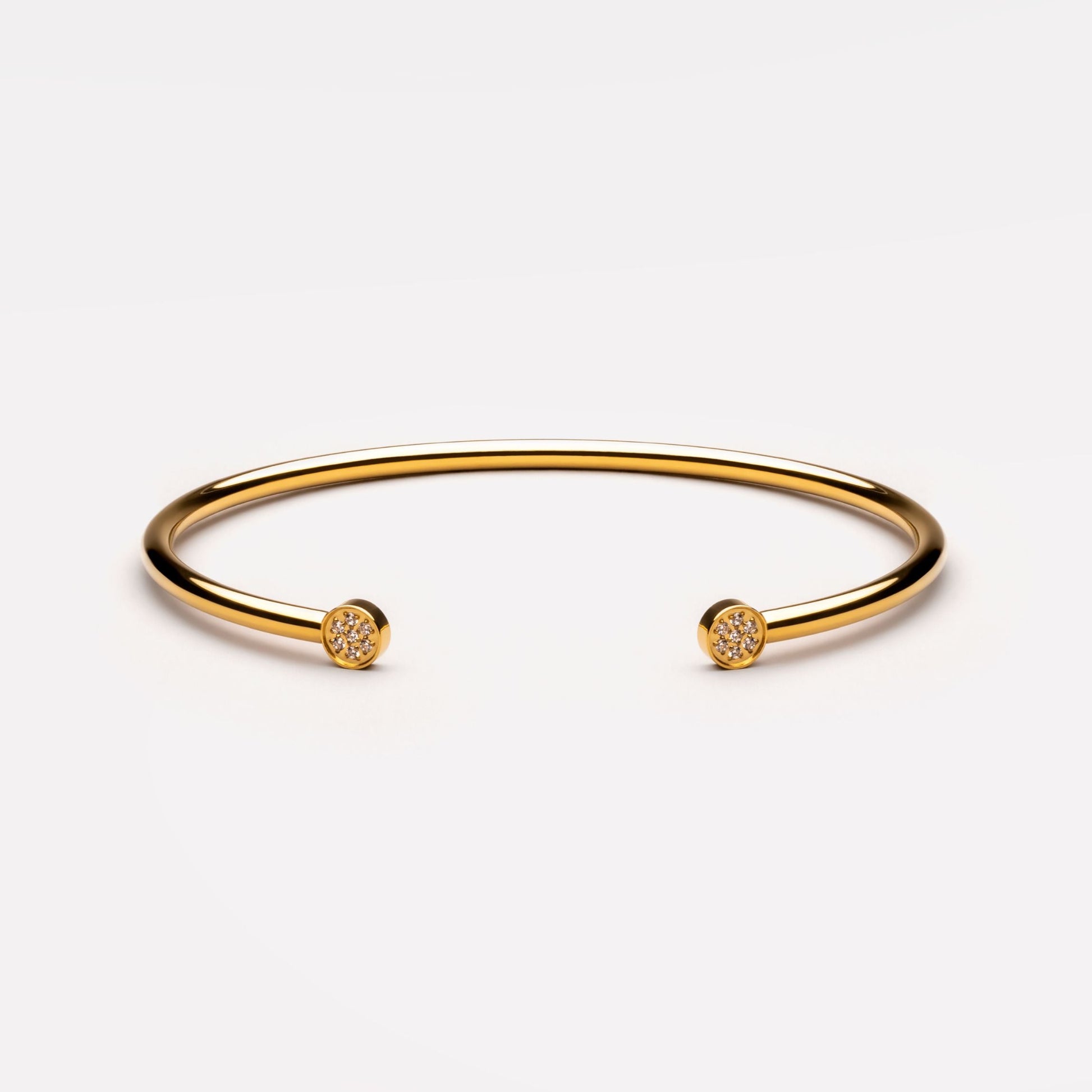 A cuff designed for those who carry light in every step. The Mirari Cuff features two luminous medallions at each open end, each one sparkling with delicate white stones that feel like captured stardust. Its balanced design offers symmetry and quiet elegance, making it a subtle yet powerful statement.